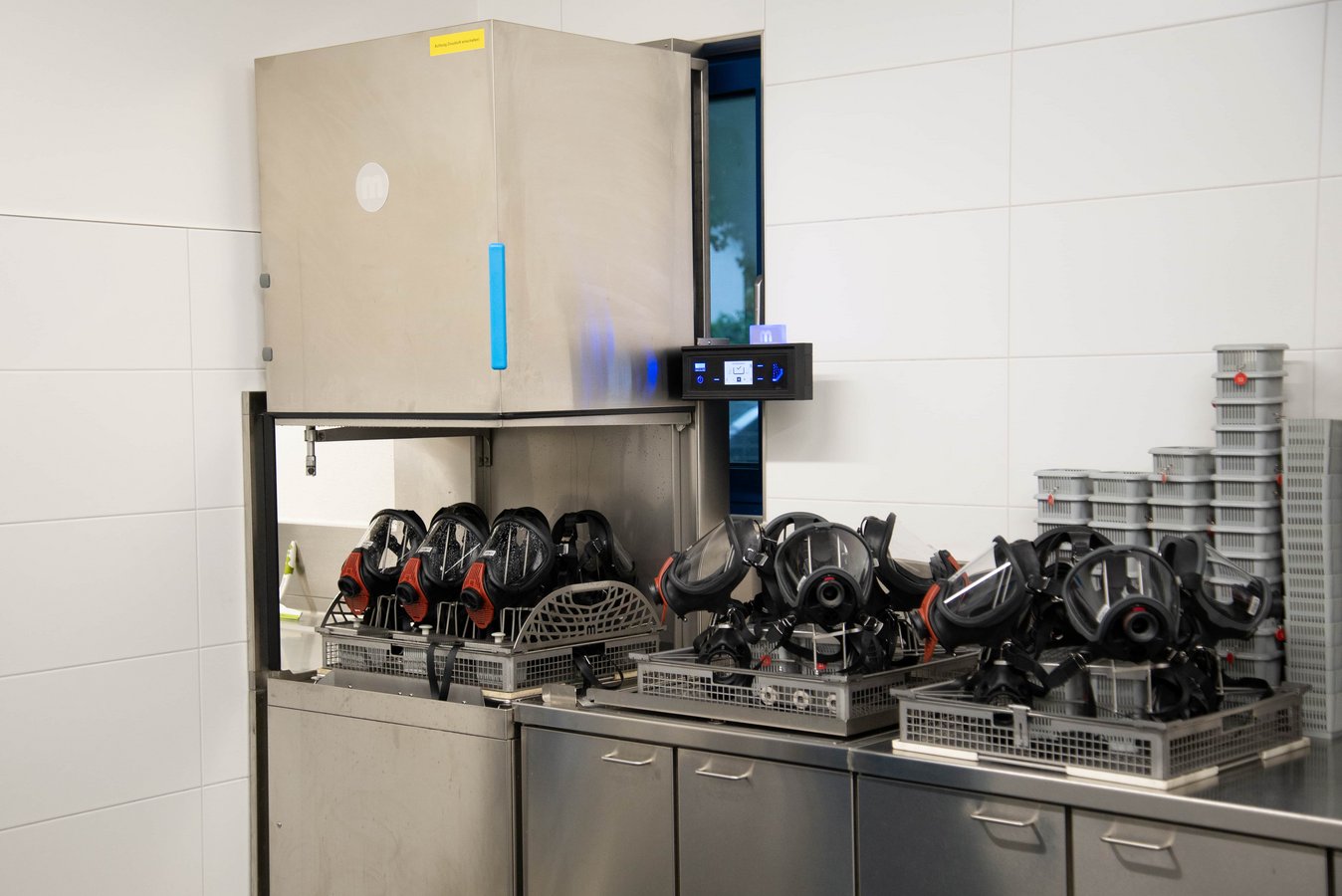 Das flexible Korbsystem der TopClean H ermöglicht die Aufbereitung von bis zu 60 Atemschutzmasken oder 80 Lungenautomaten pro Stunde bei einem maximalen Wasserverbrauch von nur fünf Litern pro Waschzyklus. Der patentierte Druckluftanschluss schützt Lungenautomaten zuverlässig vor dem Eindringen von Feuchtigkeit. Gleichzeitig verbessert die intelligente Wärmerückgewinnung das Raumklima und reduziert den Energiebedarf.