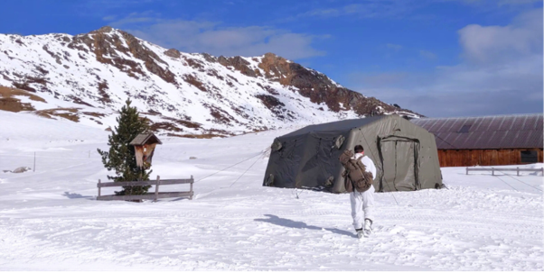 Die Übung, eine Abschlussübung für Wehrpflichtige, bot eine ideale Gelegenheit, das AZF 29 in einer realistischen, missionskritischen Umgebung zu testen. Udo Herlitze von LANCO war vor Ort, um das Zelt zu beobachten, das in einer Höhe von etwa 2.000 Metern starkem Wind, niedrigen Temperaturen und starkem Schneefall ausgesetzt war.